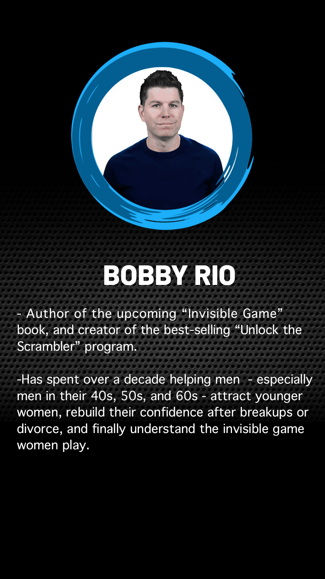 • ​He’s built one of the most respected brands in this space with over 400k YouTube subscribers and programs such as “Unlock The Scrambler” that has helped guys from all walks of life transform their dating lives.